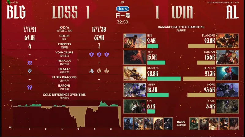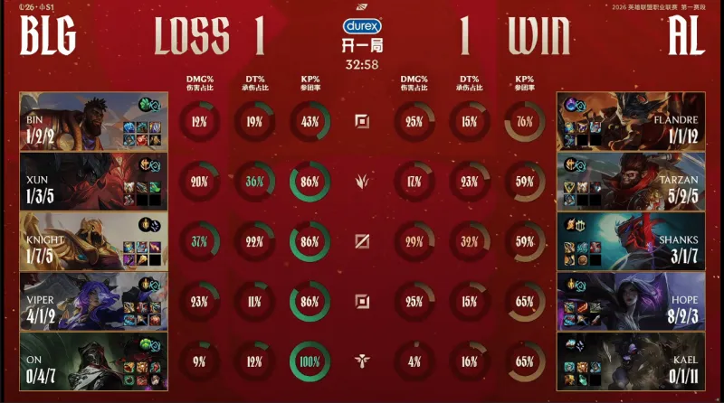 26分钟,Tarzan强开Knight失败,BLG先后击杀Hope与Shanks