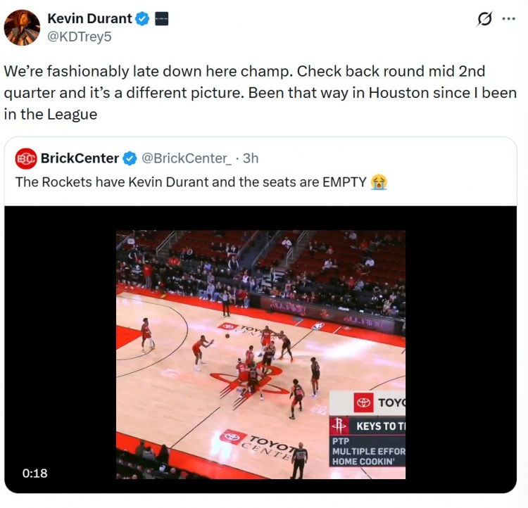 九游首页-主场现大量空座?KD解释:第二节中段才满座 休斯敦一直都是这样