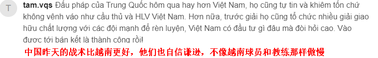 还有球迷妄自菲薄地表示,以前没怎么看过中国队的比赛,但现在看完才发现,越南队现在还不够资格站在亚洲这个舞台上(下图)。